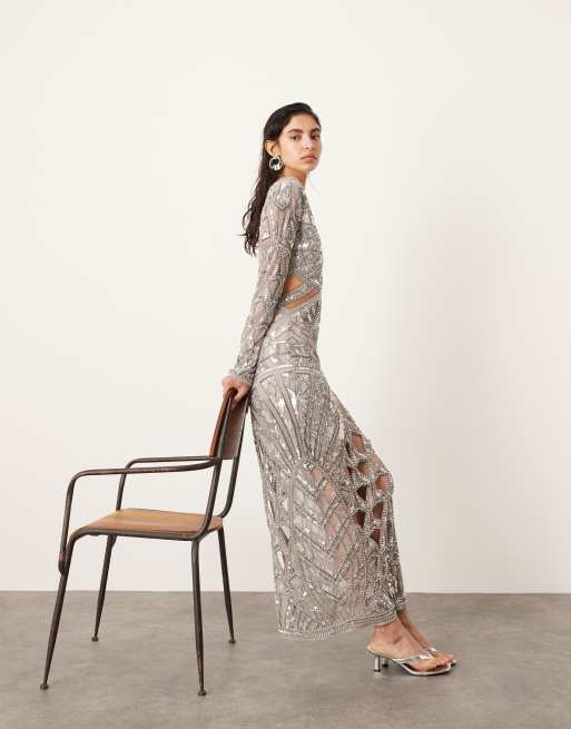 ASOS EDITION statement long sleeve sequin cut work plunge neck midaxi dress in silver