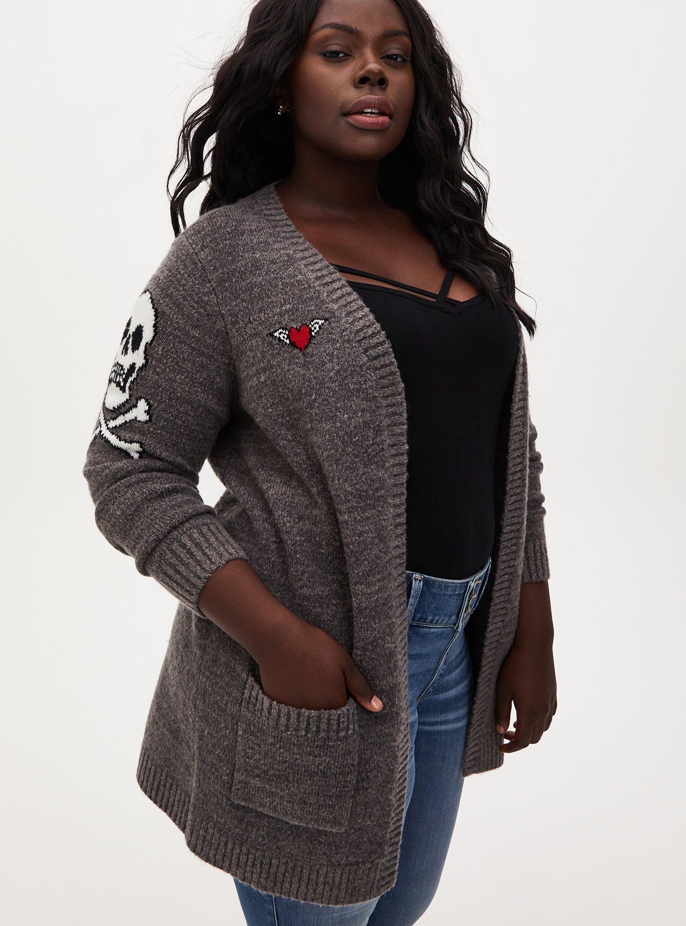 Plus Size Grey Skull Rose Open Front Cardigan Torrid