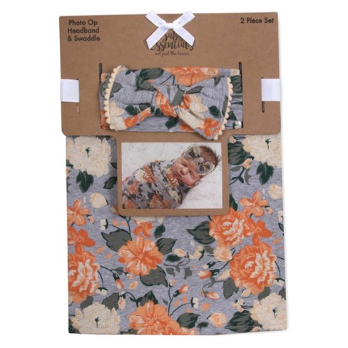 Baby Essentials Floral Harvest Swaddle Blanket And Headband Gray
