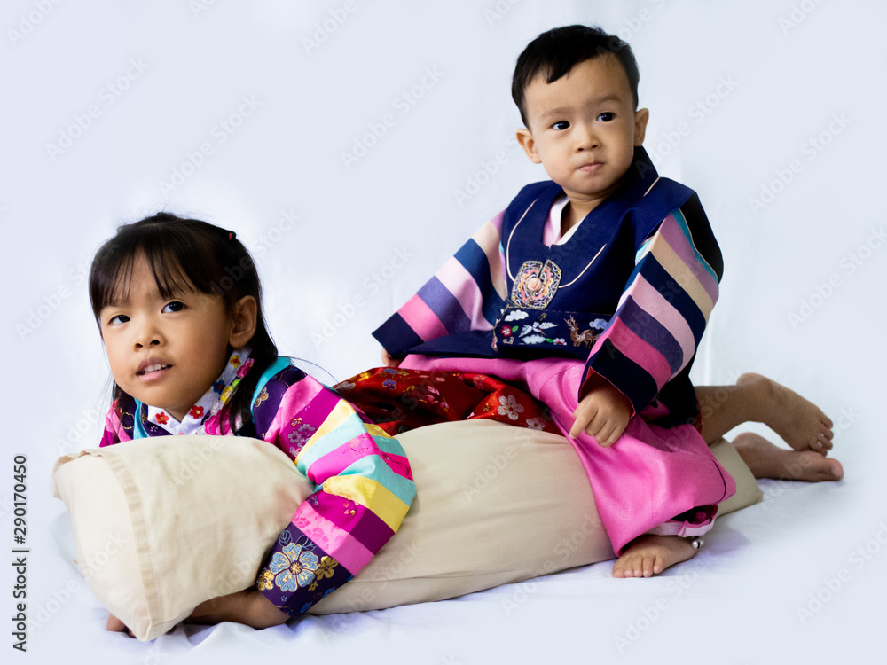 Baby boy and asian little girl wearing a Korean Traditional Hanbok