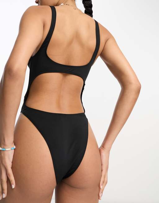 Bershka cut out front high leg swimsuit in black ASOS