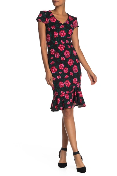 Betsey Johnson Floral V neck Flounce Hem Crepe Sheath Dress In