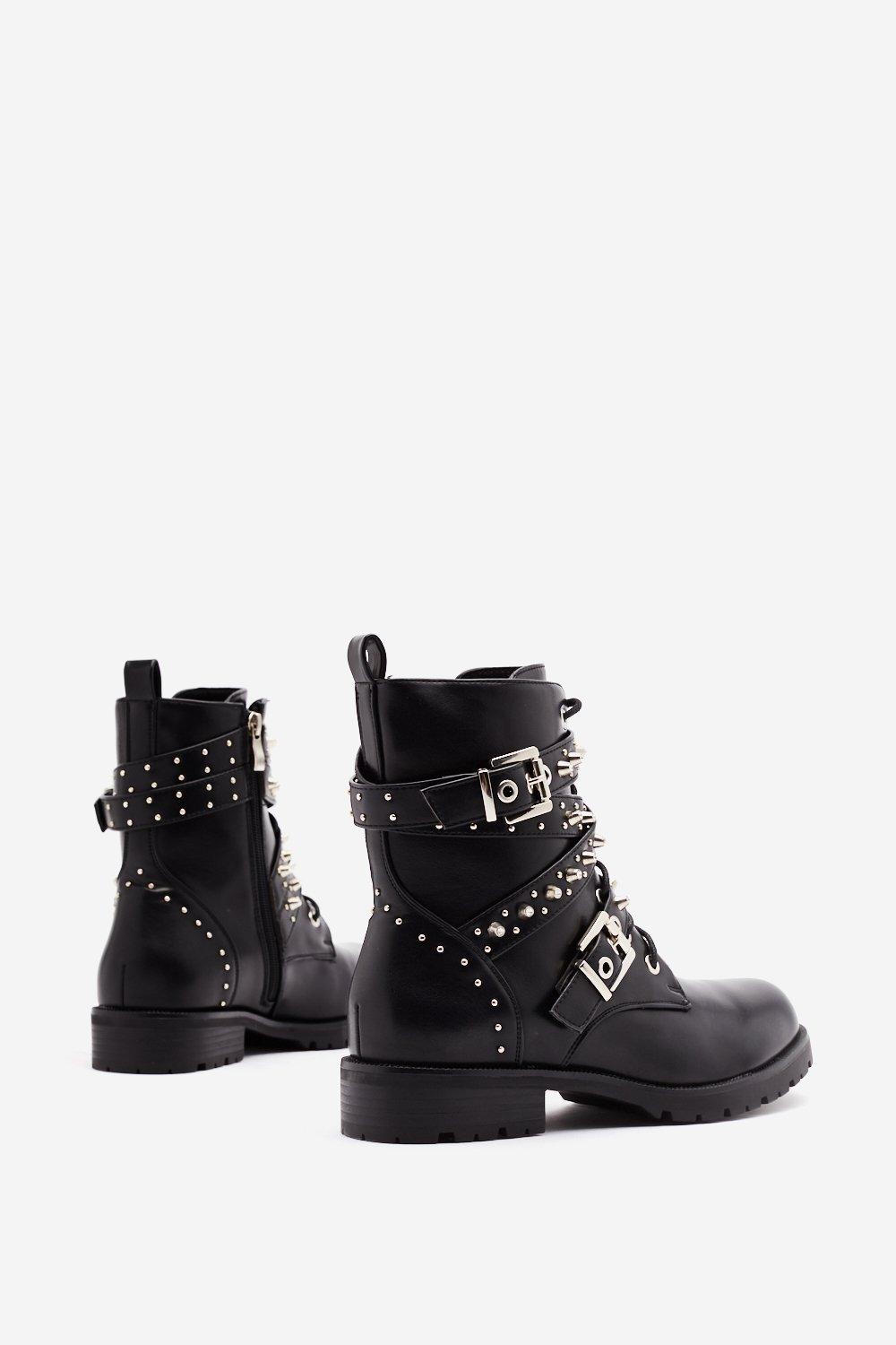 Floyd Black Studded Faux Leather Strappy Biker Boots BowsBoutiques
