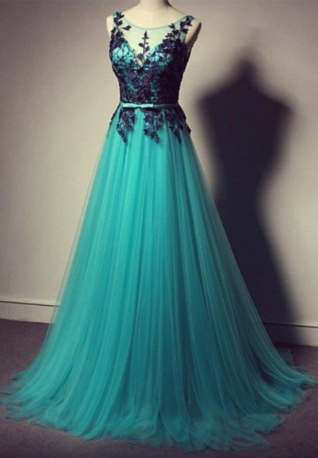 Turquoise Prom Dress With Black Lace Tulle Prom Dress long Prom