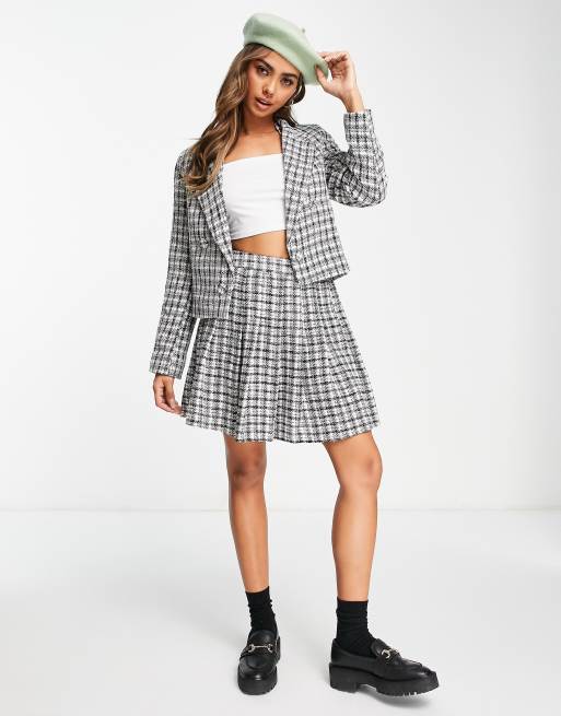 Black and white checkered skirt and jacket clearance, Model in black and white plaid tweed suit short double breasted clearance