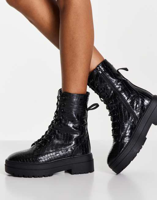 New Look chunky lace up flat ankle boots in black croc ASOS
