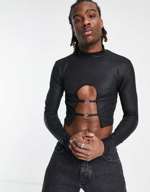 Black high neck top mens clearance, ASOS DESIGN muscle crop long sleeve t shirt in black faux leather clearance