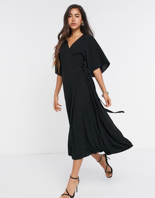 Closet London Plus kimono sleeve wrap tie midi dress in black ASOS