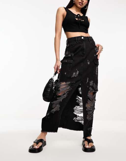 Miss Selfridge extreme ripped denim cargo skirt in washed black ASOS