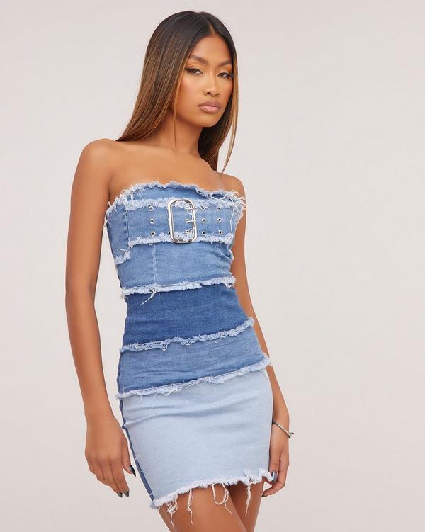 Bandeau Belt Detail Distressed Mini Bodycon Dress In Blue Denim EGO