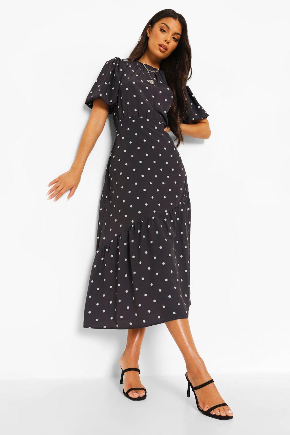 Women s Polka Dot Puff Sleeve Midi Dress Boohoo UK