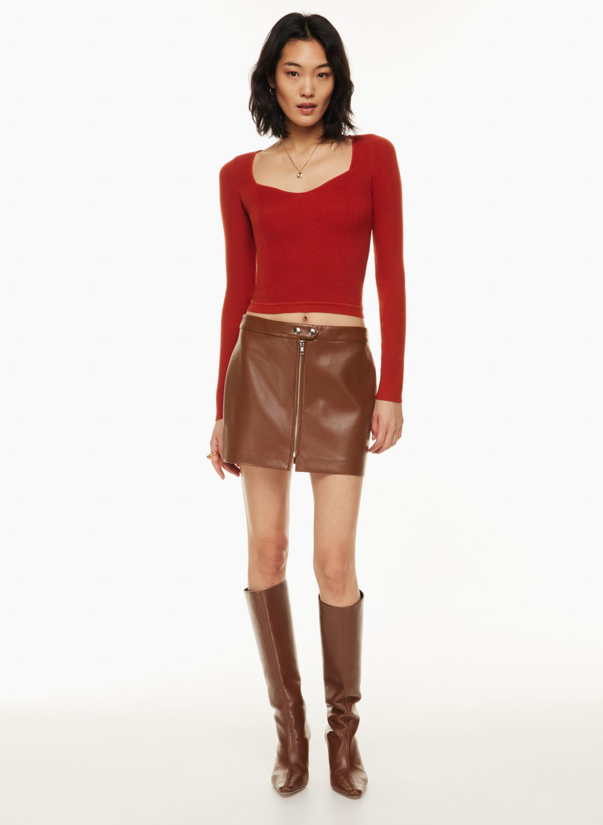A woman in a red sweater and brown skirt photo Free Long sleeve