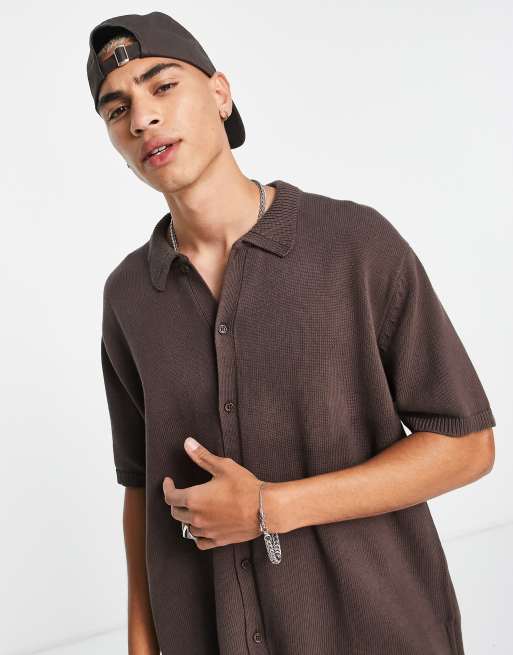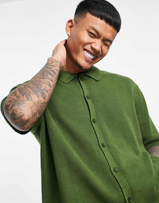 ASOS DESIGN oversized midweight knitted cotton button through polo in khaki