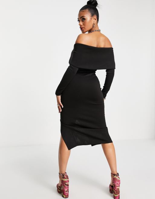 ASOS DESIGN off the shoulder sweetheart midi dress with button detail in black