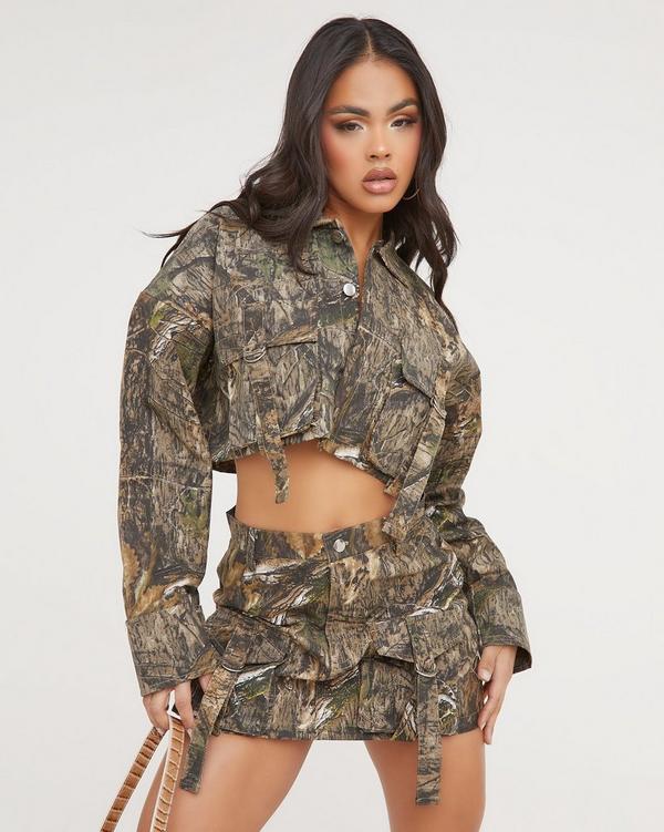 Oversized Belt Detail Cargo Style Cropped Jacket In Green Camo EGO
