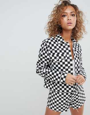 Monki oversized denim jacket in brown checkerboard denim co ord