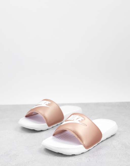 Nike Victori sliders in white and rose gold