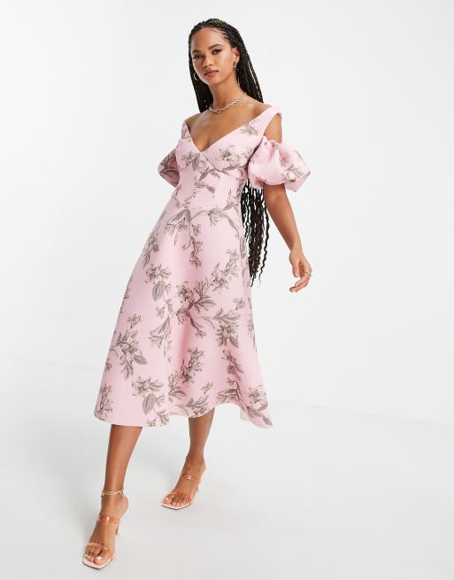 ASOS DESIGN cold shoulder corsetted prom midi dress in floral print