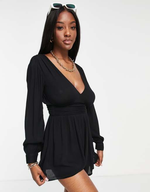 ASOS DESIGN Poitrines g n reuses Combishort de plage manches longues et d collet plongeant Noir