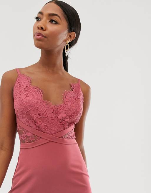 Little Mistress lace top fishtail maxi dress in dark coral ASOS