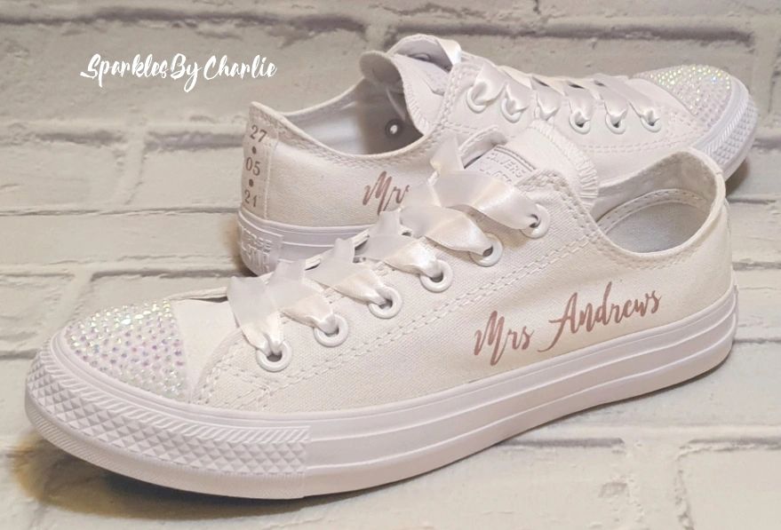 Converse Wedding Shoes White AB Crystals Blush Text White Laces