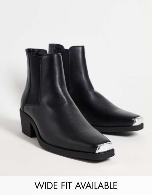 ASOS DESIGN cuban heel western chelsea boots in black faux leather with metal hardware