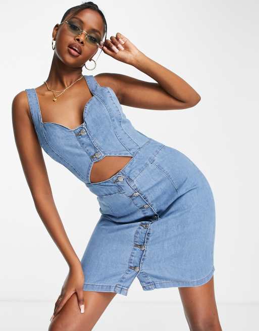 Rebellious Fashion cut out button front denim mini dress in mid blue