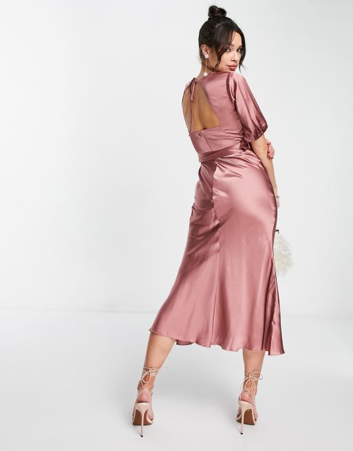 ASOS DESIGN satin bias midi tea dress with belt in dark blush