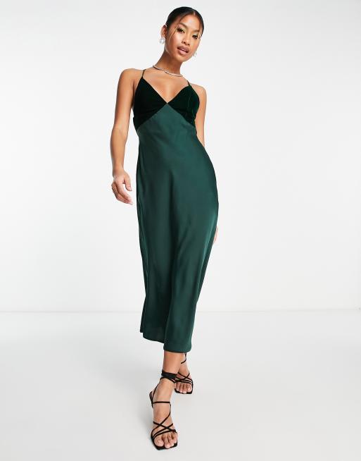 ASOS DESIGN satin midi slip dress with velvet bodice detail in forest green