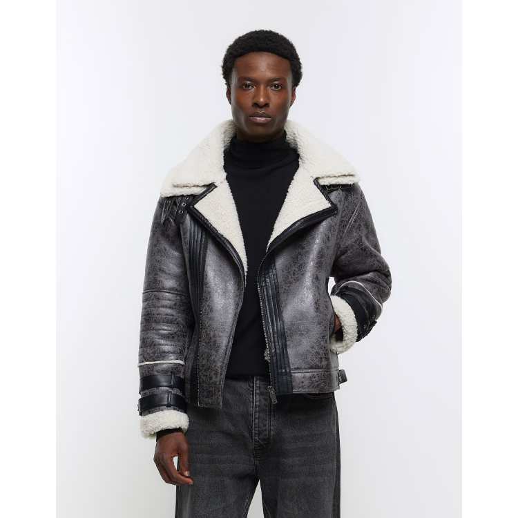 River Island crackle faux shearling aviator jacket in grey