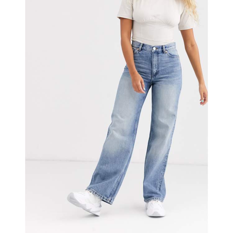Flare leg blue jeans clearance, Monki Yoko wide leg jeans in mid blue clearance