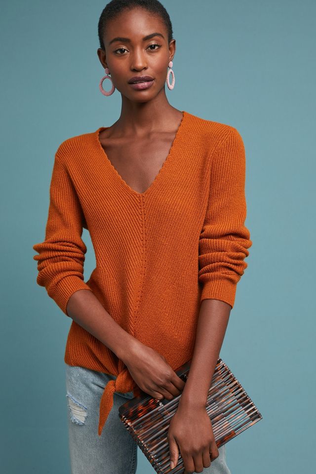 Anthropologie Moth Freeport Ribbed Knit V Neck Tie Sweater Rust