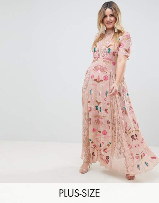 Frock And Frill Plus Allover Embroidered Plunge Front Maxi Dress