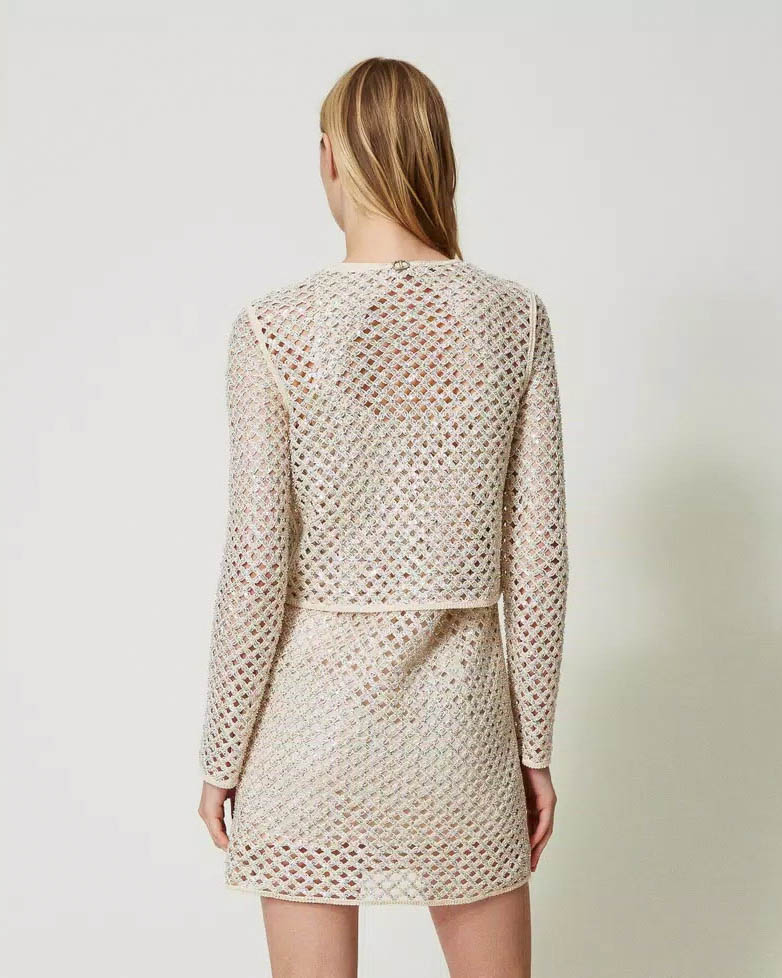 Giacchino corto beige platino in rete di cordonetto con scollo tondo