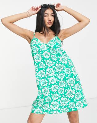 Monki Strappy Mini Dress In Green Hibiscus Floral Print ModeSens