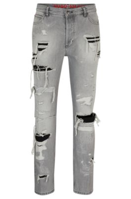HUGO Tapered fit jeans in heavily distressed silver gray denim