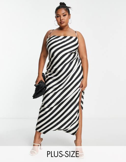In The Style Plus satin side split maxi dress with lace up back detail in monochrome stripe