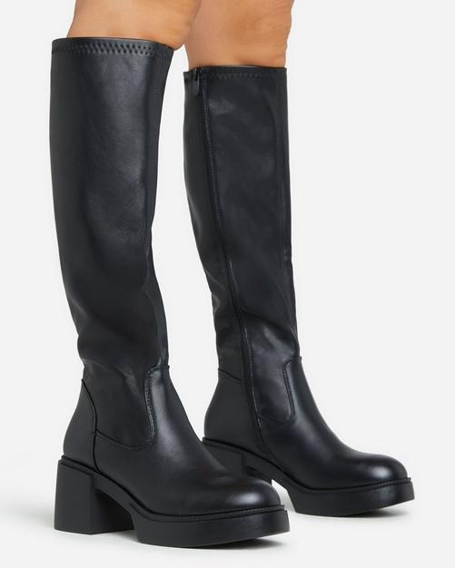 Length boots clearance, Caesar Chunky Block Heel Knee High Long Boot In Black Faux Leather clearance