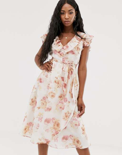 NA KD floral print v neck sleeve less midi dress in off white ASOS