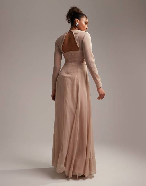 ASOS DESIGN Bridesmaid ruched waist maxi dress with long sleeves and pleat skirt in light pink