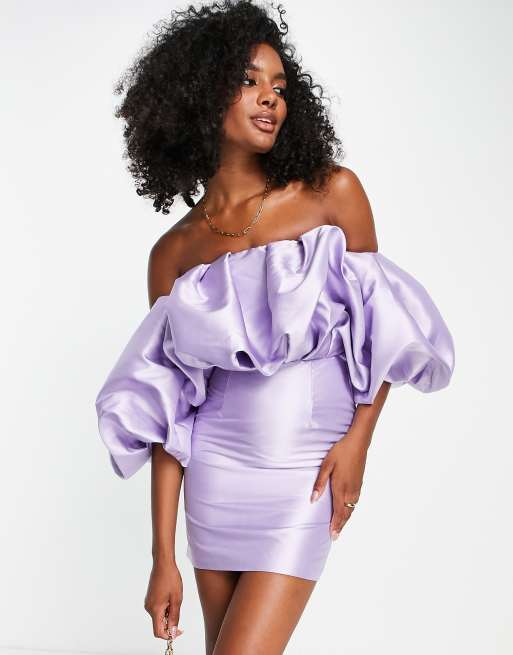 ASOS EDITION blouson off shoulder mini dress in satin twill in lilac