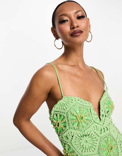 ASOS DESIGN pearl embellished sweetheart neck crochet maxi dress with split in bright green