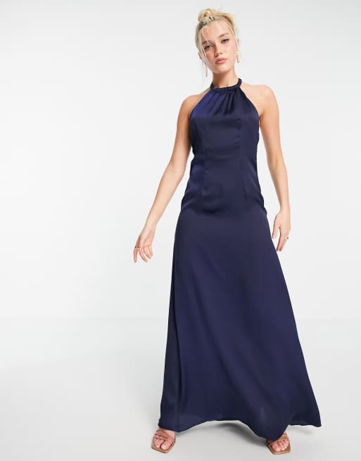Navy Satin Halter Tie Midaxi Dress Little Mistress