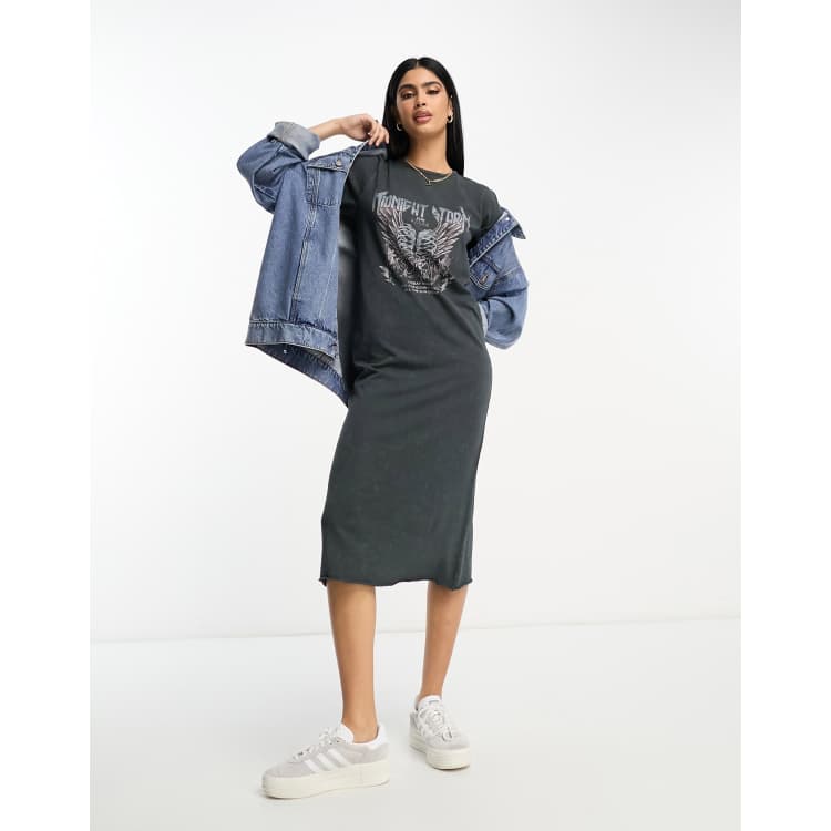 ASOS DESIGN midi t shirt dress with gothic graphic in washed charcoal