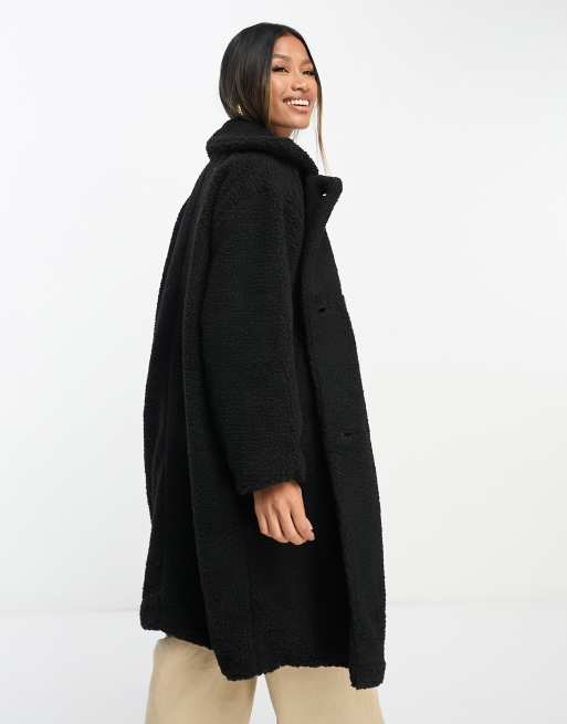 DTT Teddy longline double breasted borg jacket in black ASOS