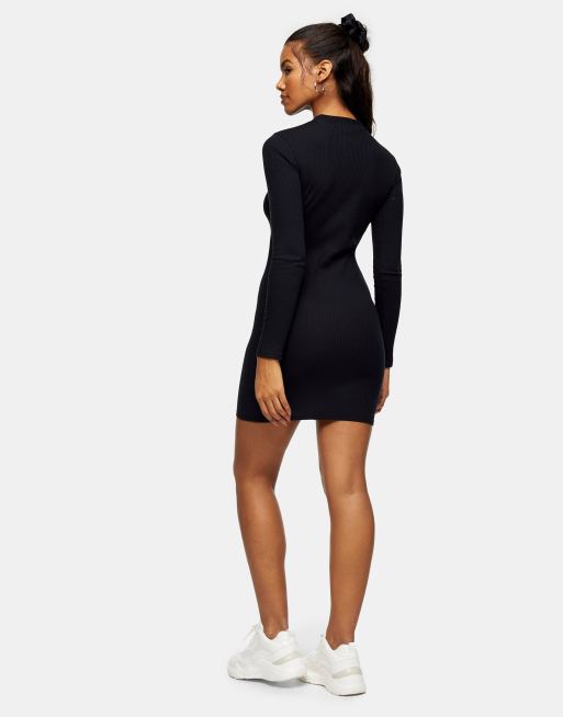 Topshop long sleeve ribbed mini dress in black