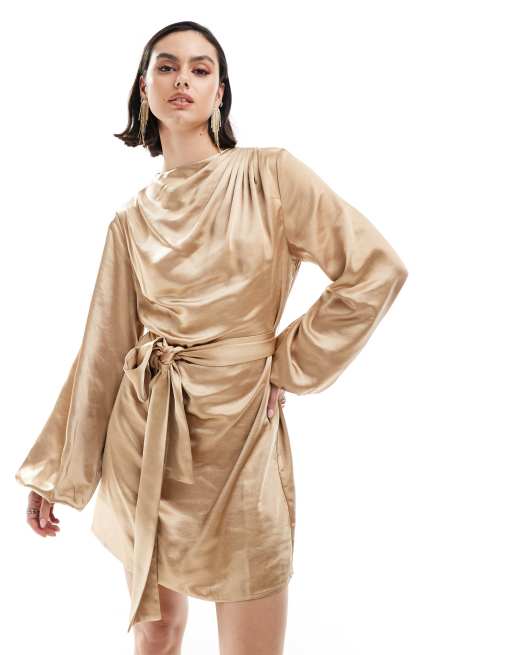 Pretty Lavish Curve tie waist satin mini dress in matte gold