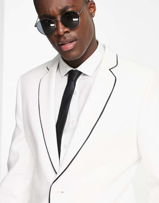 ASOS DESIGN slim suit jacket in white texture with black piping