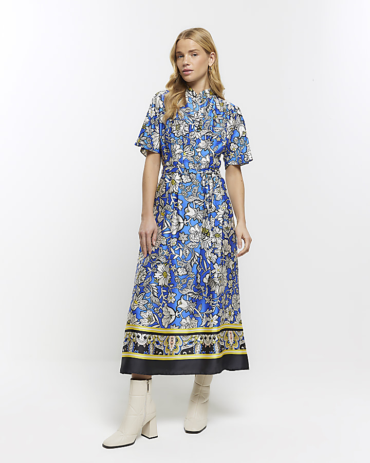 Midi shirt dress short sleeve clearance, Blue satin floral belted midi shirt dress River Island clearance