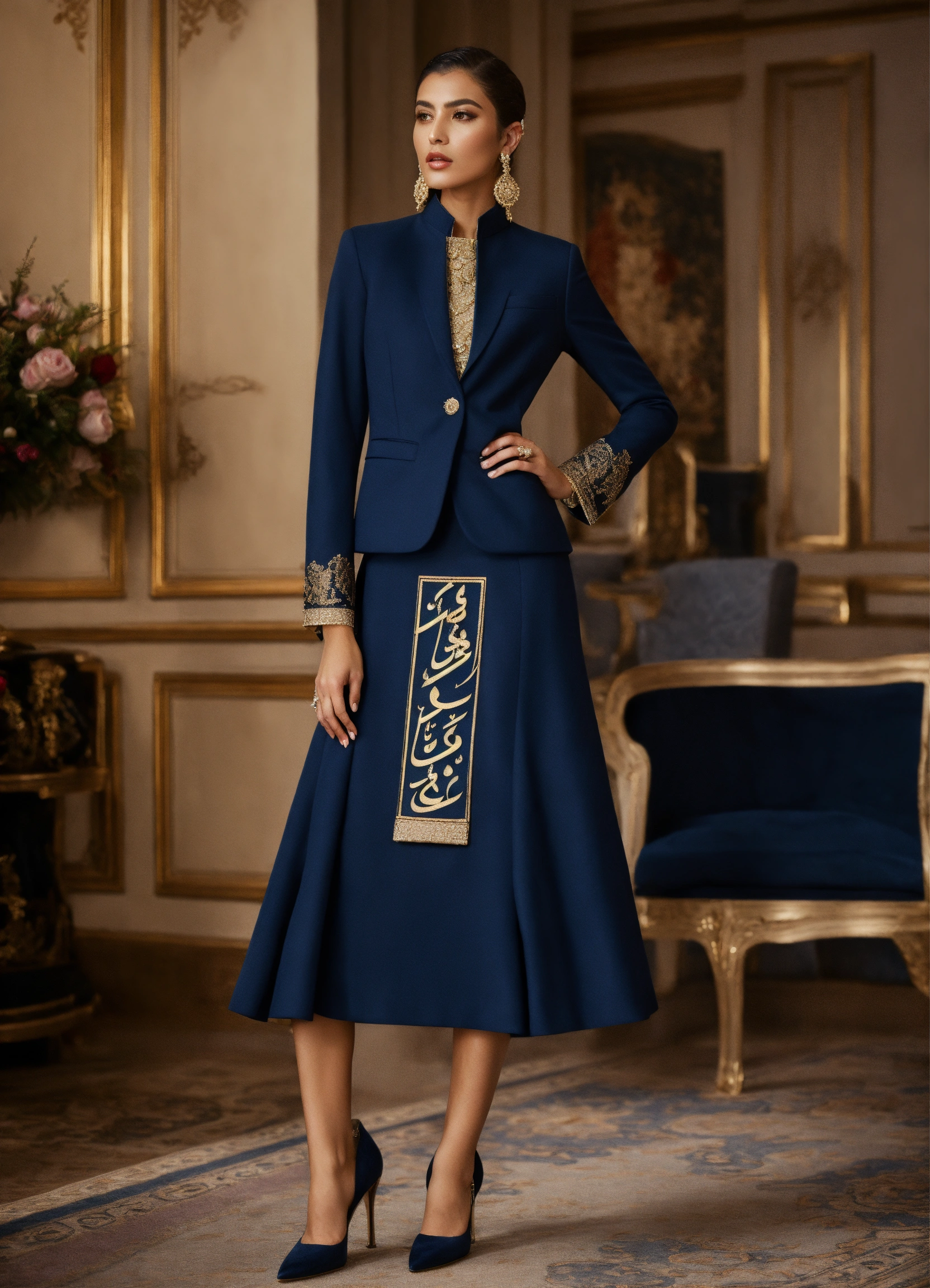 Lexica Navy blue suit jacket and skirt high collar luxury